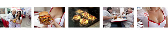America takes its love affair with the hamburger to new extremes. The Heart Attack Grill just opened its doors in Dallas, Texas, serving up glutinous, lard saturated meals to an eager clientele. "I don't eat perfectly, do you? Come on down and let's be sinners together at the Heart Attack Grill," is founder and owner, Jon Basso's – known as Dr. Jon - motto. Customers are referred to as patients and given hospital gowns and wrist bands upon entering the premises. Meals are served by waitresses in scantily clad nurse's garb, and Basso himself is dressed as a doctor. The grill's menu gives a whole new meaning to fast-food. Meals range from the single by-pass burger all the way to the quadruple by-pass burger, which sports four, one-half pound (230 grams) hamburger patties, two slices of cheese and four slices of bacon per patty, which can be accompanied by an order of flatliner fries, cooked exclusively in lard. Even the milkshakes are made with the highest cream content possible and are topped with an extra slice of butter. Weight watchers beware, the quadruple by-pass burger alone is estimated to be as much as 8,000 calories. There are no diet sodas available in this establishment. Unfiltered cigarettes and beer are also on the menu. Patients over 350 pounds (160 kilograms), on the restaurants scale, eat for free. Those who finish a quadruple by-pass meal have their vitals checked and are wheeled out the establishment in a wheel chair. The sign on the door reads "The Heart Attack Grill, the taste worth dying for." Basso's message is clear. "We sell burgers; we sell fries; we sell food for thought." Americans sharp rise in obesity rates have become a national crisis. But are Americans are sick of being told what is and isn't good for them? Perhaps they have become fatigued with yoyo dieting. Basso promises "a slow and steady weight gain. " The Heart Attack Grill serves" high calorie, high cholesterol, and high fun food," says Basso. "Laughter is what this is all about." "The American Medical Association may continue to refuse to recognize me and burgerology and that's o.k. It's their choice to remain an exclusive boys club. We treat more patients than an actual doctor ever will with our message and reach about nutrition and how we should think about food," declares Basso. People began lining up at 7 a.m. the day of the grand opening. David Matheny, amongst the first to arrive wants to be "the first patient in Dallas. It's the American way, and the burgers look awesome…burgers, fries, fried in lard, that's Texas." After tasting the double by-pass burger, he declared it was the best he'd ever had.
